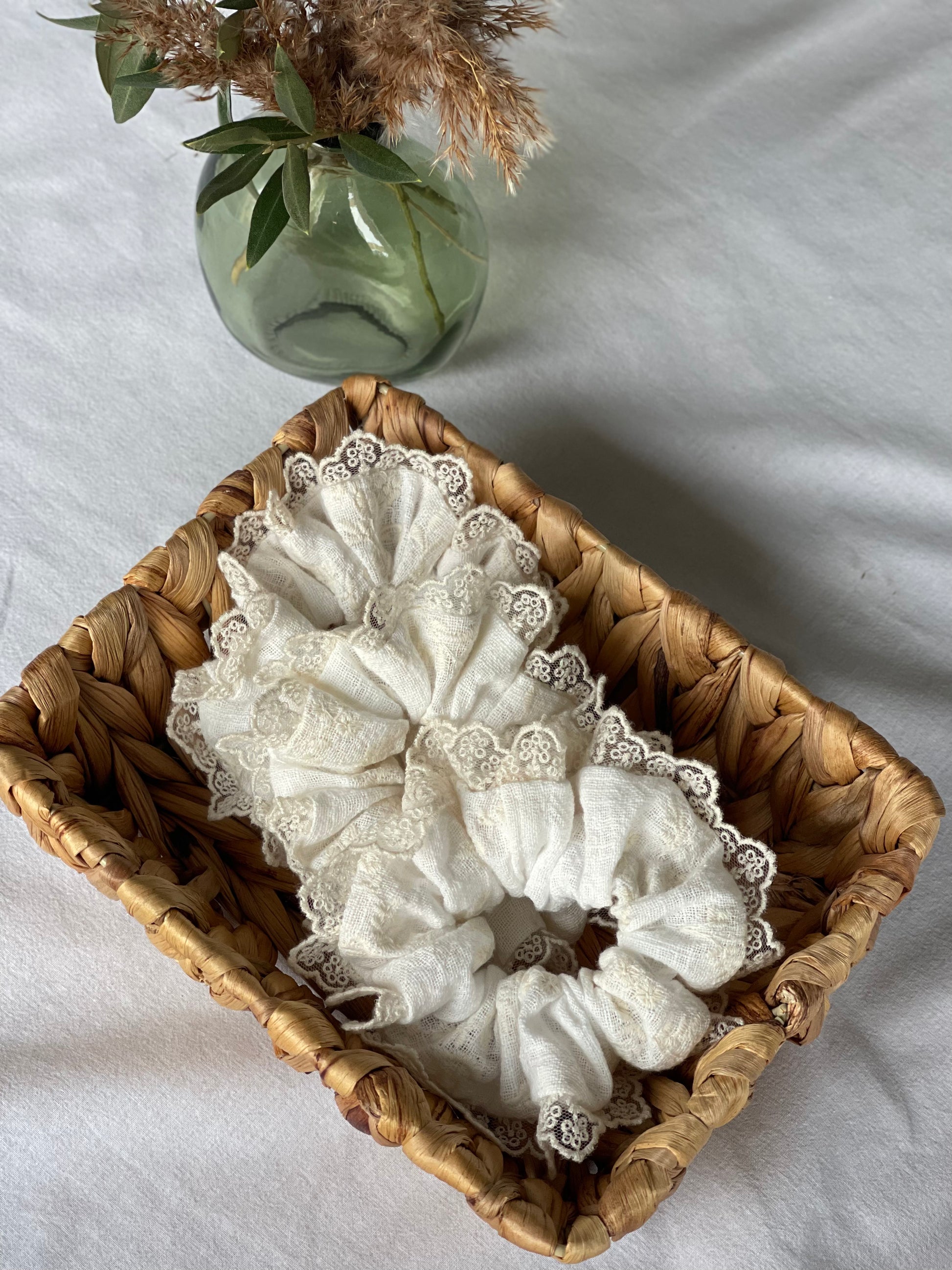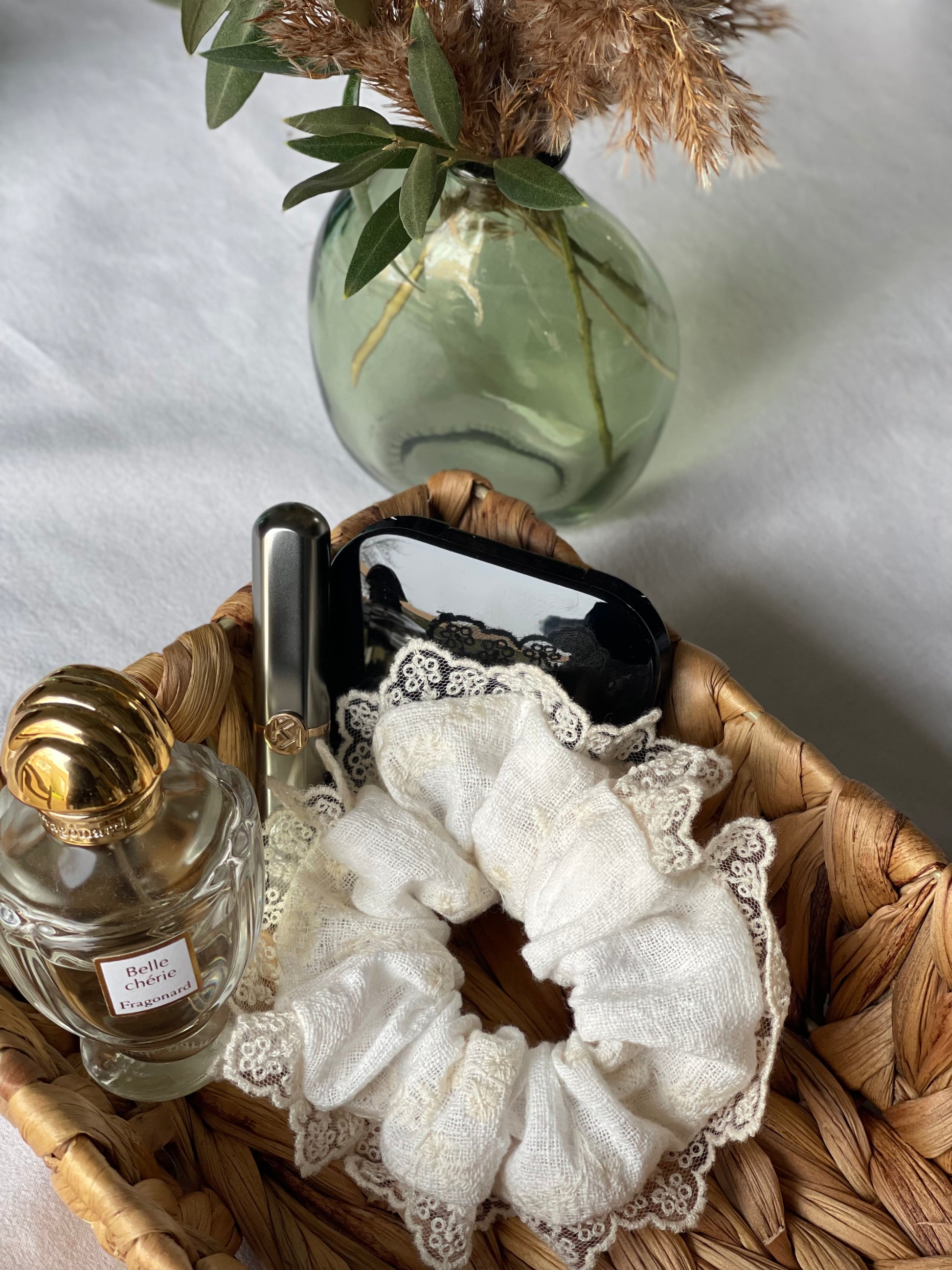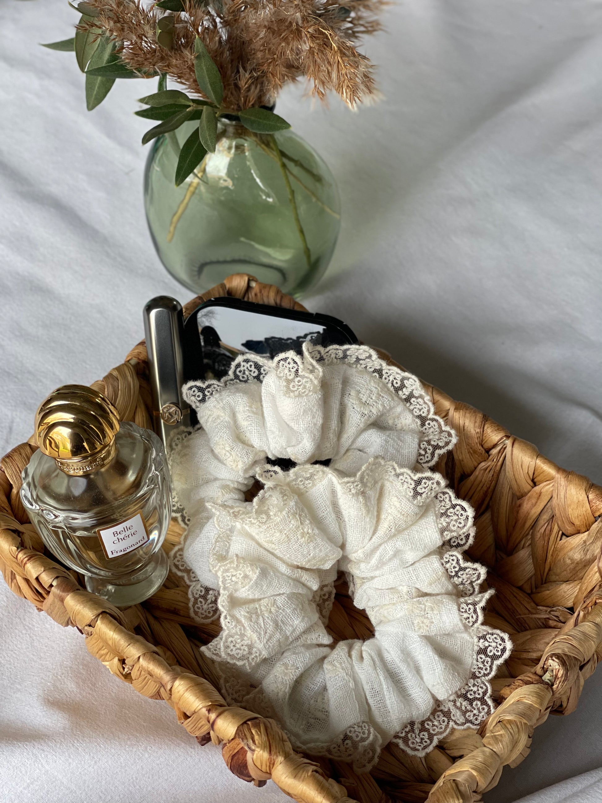 Délicat et intemporel, ce chouchou blanc est sublimé par une broderie crème raffinée et une dentelle fine qui l’entoure tout en légèreté. Une pièce douce et élégante, pensée pour apporter une touche poétique à toutes les coiffures.